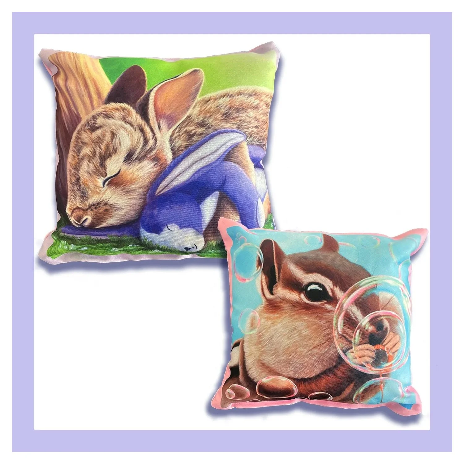 10”, 2-sided art pillow featuring artwork “Cuddly” and “Blowing Bubbles”. $25